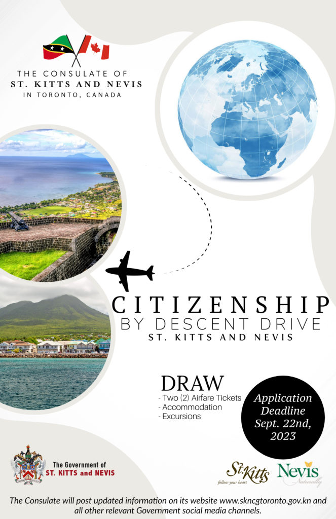 The Consulate of St Kitts and Nevis in Toronto, with the support of the High Commission in Ottawa, the Ministry of Foreign Affairs, and the Ministry of Tourism, encourages Nationals in the diaspora to apply in its ongoing Citizenship by Descent Drive. The Consulate extended the deadline to receive applications to September 22, 2023. One (1) successful applicant will have the opportunity to win two (2) airfare tickets to the Federation, accommodation, and excursions while on the islands. The draw date will coincide with the 40th Anniversary of Independence celebrations as the nation reflects on its long, rich history from slavery to colonization and the smallest independent sovereign nation in the western hemisphere.